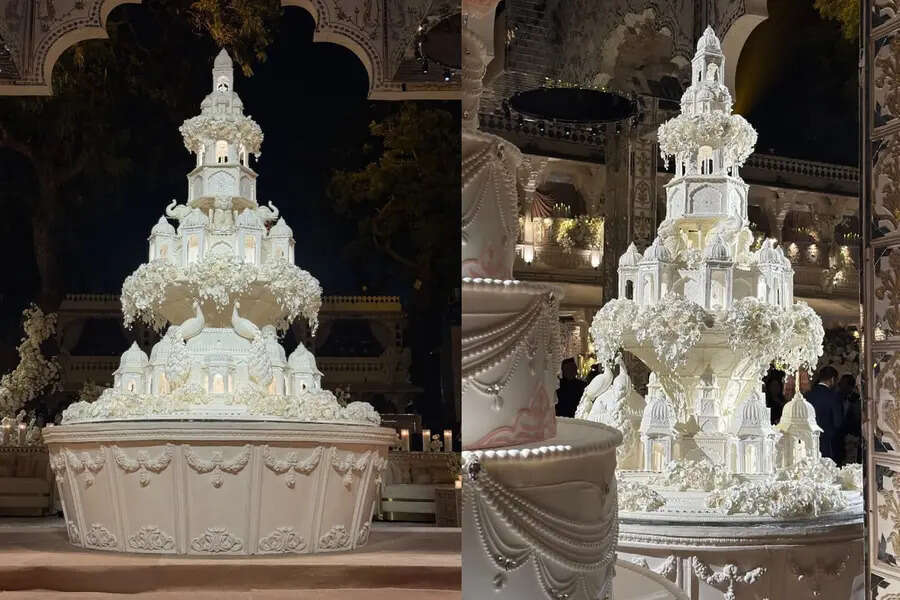 മൃദുവായ വെളുത്ത പാലറ്റിൽ പൂർത്തിയാക്കിയ ഉയർന്ന മൾട്ടി-ടയർ കേക്ക് രാജസ്ഥാനി വാസ്തുവിദ്യയെ ആദരിച്ചു. രാജകൊട്ടാരങ്ങളുടെയും കോട്ടകളുടെയും ഗാംഭീര്യം പ്രതിധ്വനിപ്പിക്കുന്ന സങ്കീർണ്ണമായ കൊത്തുപണികളുള്ള മിനിയേച്ചർ താഴികക്കുടങ്ങൾ, ജാരോകകൾ, ഛത്രികൾ എന്നിവ ഇതിൽ ഉണ്ടായിരുന്നു. മോണോക്രോം സൗന്ദര്യശാസ്ത്രത്തെ തകർക്കാതെ ആനകൾ, കടുവകൾ, മയിലുകൾ എന്നിവയുൾപ്പെടെയുള്ള ഐക്കണിക് മരുഭൂമിയിലെ മൃഗങ്ങളുടെ രൂപങ്ങൾ തടസ്സമില്ലാതെ ഉൾപ്പെടുത്തിയിട്ടുണ്ട്.