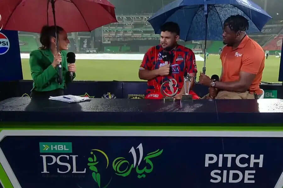 ലാഹോർ: പാകിസ്ഥാൻ സൂപ്പർ ലീഗ് മത്സരത്തിന്റെ മത്സരത്തിന് ശേഷമുള്ള അവതരണത്തിനിടെ മഴ കളിയെ നശിപ്പിച്ചു, വേദിയിൽ നിരവധി തമാശയും കുഴപ്പങ്ങളും നിറഞ്ഞ നിമിഷങ്ങൾക്ക് തുടക്കമിട്ടു.