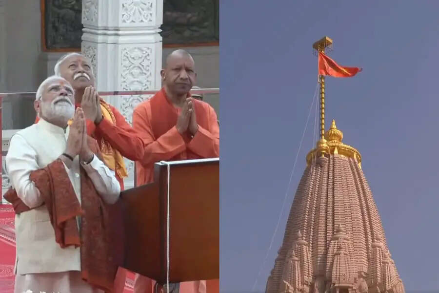 ചരിത്ര നിമിഷം: രാമജന്മഭൂമി ക്ഷേത്രത്തിൽ പ്രധാനമന്ത്രി മോദി കാവി പതാക ഉയർത്തി